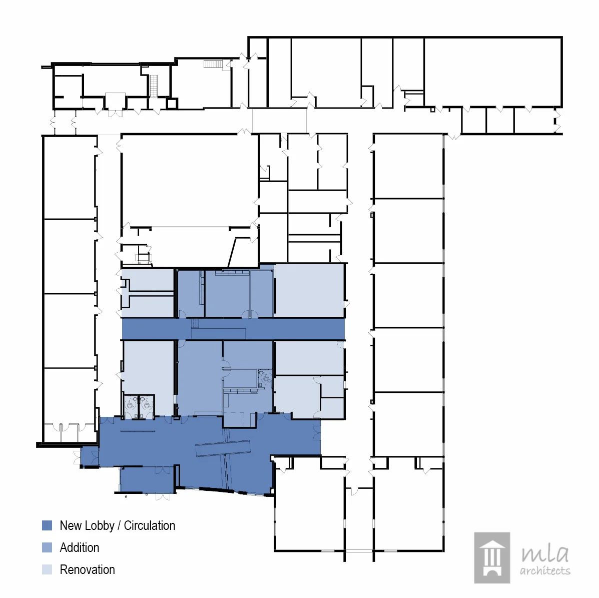 MLA Architects planned and designed a new secured-entry and office space addition and remodeling for the existing Early Childhood and Family Center building, including HVAC upgrades.